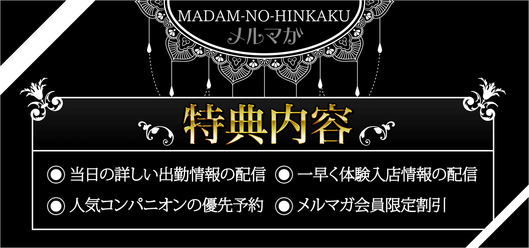 ※携帯電話のドメイン指定受信をされている方は【madam-info@madam-no-hinkaku.com】を設定してからご登録願います。